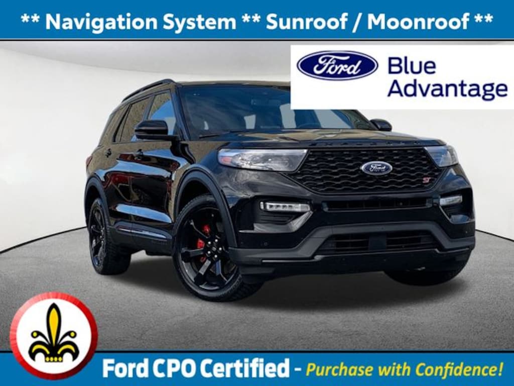 Navigation System, Sunroof / Moonroof, Blind Spot Monitor, Apple CarPlay / Android Auto, Lane Keeping Assistance, Adaptive Cruise Control, Cross Traffic Alert, Power Leather Seats, Heated Seats, Backup Camera, Bluetooth, Remote Engine Starter, Cruise Control, Power Windows, Power Locks, Steering Wheels Radio Controls, Aluminum Wheels, Luggage Rack, Third Row Seats, 4WD, 10.1" LCD Capacitive Portrait Touchscreen, 110V/150W AC Power Outlet, 2 Additional Speakers, 360-Degree Camera w/Split View, Auto-Dimming Rearview Mirror (Interior), Equipment Group 401A, Evasive Steering Assist, Ford Co-Pilot360 Assist+, Front Parking Sensors, Front Rain-Sensing Wipers, Intelligent Adaptive Cruise Control, Memory Driver's Seat, Performance Front & Rear Brakes, Power Tilt/Telescoping Steering Column, Radio: B&O Sound System by Bang & Olufsen, Reverse Brake Assist, Second Row Heated Seats, Sideview Mirrors w/Gloss Black Caps, Speed Sign Recognition, ST High Package, ST Street Pack, Technology Package, Third Row PowerFold (Folds Flat), Universal Garage Door Opener (UGDO), Voice-Activated Touchscreen Navigation System, Wheels: 21" Aluminum, Wireless Charging Pad. Certified. Agate Black Metallic 2023 Ford Explorer ST 4D Sport Utility ST 4WD 10-Speed Automatic