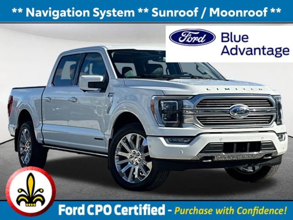 Navigation System, Sunroof / Moonroof, Blind Spot Monitor, Apple CarPlay / Android Auto, Lane Keeping Assistance, Adaptive Cruise Control, Cross Traffic Alert, Parking Assistance, Power Leather Seats, Heated Seats, Backup Camera, Bluetooth, Remote Engine Starter, Cruise Control, Power Windows, Power Locks, Steering Wheels Radio Controls, Aluminum Wheels, Running Boards / Side Steps, Towing Package, 3.5L PowerBoost Full-Hybrid V6, 4WD, GVWR: 7,050 lbs Payload Package, Navigation system: Connected Navigation. Certified. Oxford White 2023 Ford F-150 Limited 4D SuperCrew Limited 4WD 10-Speed Automatic