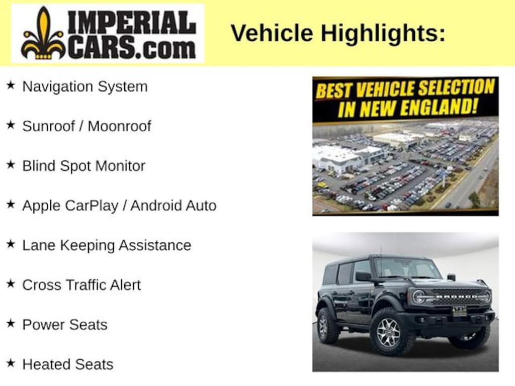 The Bronco Badlands' mid-level Equipment Group 332A package further enhances your driving experience with dual-zone electronic automatic temperature control, a power outlet in the back of the center console, dual smart charging USB ports, and heated front seats. The advanced Ford Co-Pilot360 suite of driver-assist technologies, including Blind Spot Information System, Cross-Traffic Alert, and Lane-Keeping System, ensures your safety and confidence on the road.