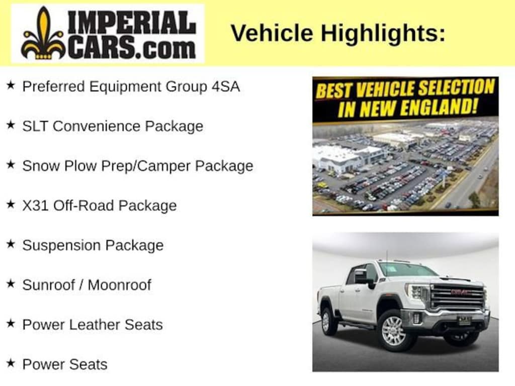 Sunroof / Moonroof, Power Leather Seats, Power Seats, Heated Seats, Backup Camera, Bluetooth, Cruise Control, Power Windows, Power Locks, Steering Wheels Radio Controls, Aluminum Wheels, Running Boards / Side Steps, 6-Speed Automatic, 4WD, Jet Black Leather, 10-Way Power Driver Seat Adjuster w/Lumbar, 12-Volt Rear Auxiliary Power Outlet, 120-Volt Bed Mounted Power Outlet, 120-Volt Instrument Panel Power Outlet, 2 USB Ports, 2 USB Ports (1st Row), 2-Speed Active Transfer Case, 220 Amps Alternator, 2nd Row Dual USB Charge-Only Ports, 4.2 Diagonal Color Display Driver Info Center, 4G LTE Wi-Fi Hotspot Capable, Chrome Surround Grille w/High Gloss Black Mesh, Compass Located In Instrument Cluster, Deep-Tinted Glass, Electric Rear-Window Defogger, Electrical Lock Control Steering Column, Floor-Mounted Center Console, Front Bucket Seats, GMC Connected Access Capable, Heated & Ventilated Front Bucket Seats, Heated 2nd Row Outboard Seats, Heated Driver & Front Outboard Passenger Seats, Hill Descent Control, Integrated Trailer Brake Controller, Keyless Open & Start, LED Cargo Area Lighting, LED Smoked Amber Roof Marker Lamps, Manual Tilt-Wheel/Telescoping Steering Column, Off-Road Suspension, OnStar & GMC Connected Services Capable, Power Door Locks, Power Front Passenger Windows w/Express Up/Down, Power Rear Windows w/Express Down, Power Sliding Rear Window w/Defogger, Power Windows w/Driver Express Up/Down, Preferred Equipment Group 4SA, Rear Wheelhouse Liners, Remote Vehicle Starter System, SLT Convenience Package, Snow Plow Prep/Camper Package, Steering Wheel Audio Controls, Suspension Package, Unauthorized Entry Theft-Deterrent System, Universal Home Remote, Wireless Phone Projection, X31 Off-Road Package. Certified. White Frost Tricoat 2021 GMC Sierra 2500HD SLT 4D Crew Cab SLT 4WD 6-Speed Automatic