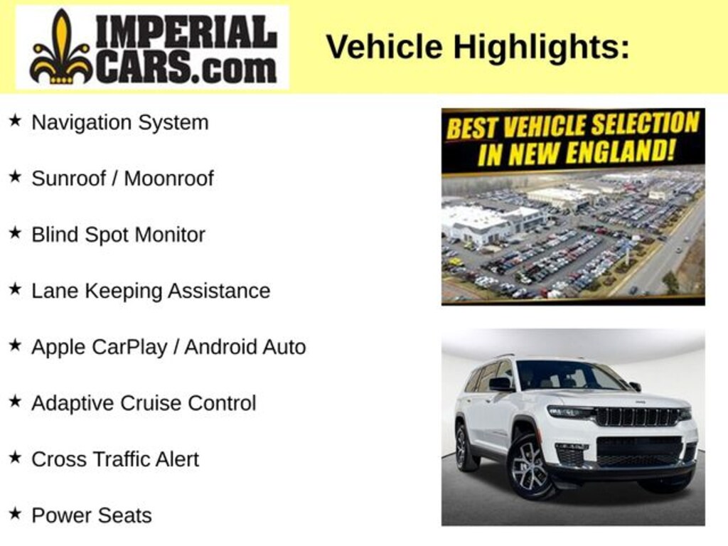 Recent Arrival! Navigation System, Sunroof / Moonroof, Blind Spot Monitor, Lane Keeping Assistance, Apple CarPlay / Android Auto, Adaptive Cruise Control, Cross Traffic Alert, Power Seats, Heated Seats, Backup Camera, Bluetooth, Remote Engine Start, Cruise Control, Power Windows, Power Locks, Steering Wheels Radio Controls, Aluminum Wheels, Luggage Rack, Third Row Seats, 220 Amp Alternator, 7 & 4 Pin Wiring Harness, Automatic Headlamp Leveling System, Class IV Receiver Hitch, Dual Exhaust Tips, Heavy-Duty Engine Cooling, Navigation System, Quick Order Package 23E, Rear Load Leveling Suspension, Trailer Hitch Zoom, Trailer Tow Package. Bright White Clearcoat 2024 Jeep Grand Cherokee L Limited 4D Sport Utility Limited 4WD 8-Speed Automatic