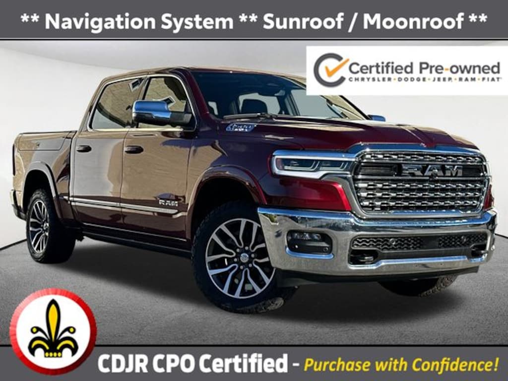 Recent Arrival! Navigation System, Sunroof / Moonroof, Blind Spot Monitor, Lane Keeping Assistance, Apple CarPlay / Android Auto, Adaptive Cruise Control, Power Leather Seats, Cross Traffic Alert, Heated Seats, Backup Camera, Bluetooth, Remote Engine Start, Cruise Control, Power Windows, Power Locks, Steering Wheels Radio Controls, Aluminum Wheels, Running Boards / Side Steps, Towing Package, GPS Navigation, Navigation System, Quick Order Package 22M Limited. Delmonico Red Pearlcoat 2025 Ram 1500 Limited 4D Crew Cab Limited 4WD 8-Speed Automatic