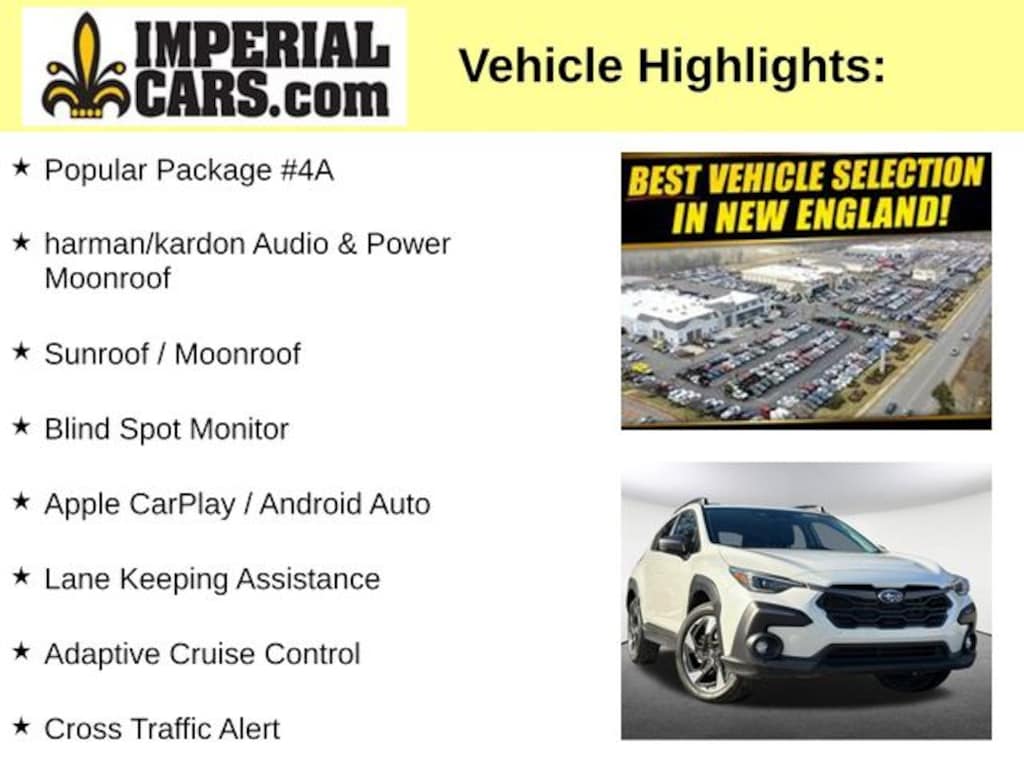 Sunroof / Moonroof, Blind Spot Monitor, Apple CarPlay / Android Auto, Lane Keeping Assistance, Adaptive Cruise Control, Cross Traffic Alert, Power Leather Seats, Heated Seats, Backup Camera, Bluetooth, Cruise Control, Power Windows, Power Locks, Steering Wheels Radio Controls, Aluminum Wheels, Luggage Rack, All-Weather Floor Liners, Auto-Dimming Exterior Mirror w/Approach Light, Auto-Dimming Mirror w/Compass & HomeLink, harman/kardon Audio & Power Moonroof, harman/kardon Surround Sound Speaker System, Popular Package #4A, Power Moonroof, Rear Bumper Cover, Splash Guards. Certified. Crystal White Pearl 2025 Subaru Crosstrek Limited 4D Sport Utility Limited AWD Lineartronic CVT
