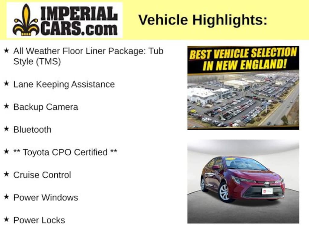 Lane Keeping Assistance, Backup Camera, Bluetooth, ** Toyota CPO Certified **, Cruise Control, Power Windows, Power Locks, Steering Wheel Radio Controls, Aluminum Wheels, All Weather Floor Liner Package: Tub Style (TMS). Certified. Ruby Flare Pearl 2024 Toyota Corolla LE LE 4D Sedan 2.0L I4 DOHC 16V FWD CVT