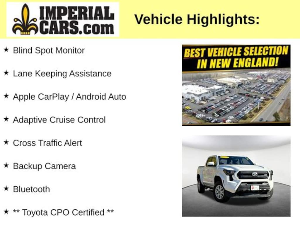 New Price! Blind Spot Monitor, Lane Keeping Assistance, Apple CarPlay / Android Auto, Adaptive Cruise Control, Cross Traffic Alert, Backup Camera, Bluetooth, ** Toyota CPO Certified **, Cruise Control, Power Windows, Power Locks, Steering Wheel Radio Controls, Aluminum Wheels, Towing Package, 4WD. Certified. Ice Cap 2024 Toyota Tacoma SR5 SR5 4D Double Cab 2.4L 4-Cylinder 4WD 8-Speed Automatic