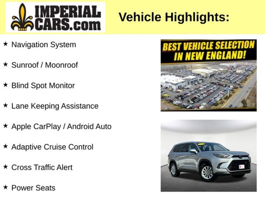 Indulge in a host of premium features, including - a Navigation System, Sunroof / Moonroof, Blind Spot Monitor, Lane Keeping Assistance, Apple CarPlay / Android Auto, Adaptive Cruise Control, Cross Traffic Alert, Power Seats, Heated Seats, and a Backup Camera. Additionally, this Grand Highlander is equipped with - Door Edge Guards, Mudguards, and an All-Weather Floor Liner/Cargo Tray.