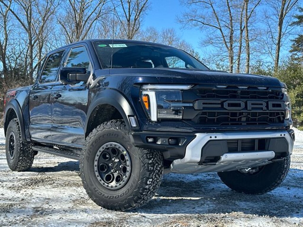 EQUIPMENT GROUP 802A RAPTOR 37 Dual Valve Shocks, Wheels: Raptor 37 Unique 17 Cast Aluminum, Bead lock capable, Carbon Fiber Interior Appliques, Modular Front Bumper, Tires: 37x12.5R17 BSW All-Terrain, GVWR: 7,400 lbs, TWIN PANEL MOONROOF, TOUGH BED SPRAY-IN BEDLINER, TRANSMISSION: ELECTRONIC 10-SPEED AUTOMATIC SelectShift w/paddle shifters and terrain management modes: normal, sport, tow-haul, slippery, rock crawl, off-road and baja (STD). Ford Raptor with Antimatter Blue exterior and Black interior features a V6 Cylinder Engine with 450 HP at 5250 RPM*.