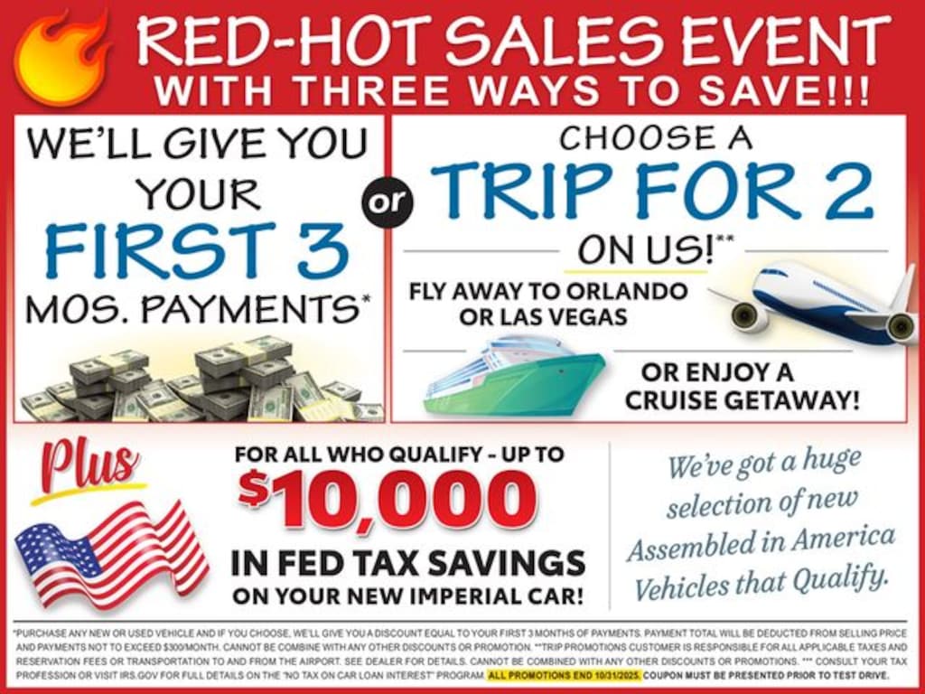 Please be aware that the price listed for the vehicle does not include tax, title, registration, documentation fee, or any other applicable fees. However, it does include a trade-in assistance bonus of $1,000 for qualifying retailable trades with less than 10 years of use from the original in-service date. To be eligible for the advertised promotional price, you must pay in full and take delivery of the vehicle from dealer stock on the same day. For the most up-to-date information and Imperial discounts, please call or email our phone and internet team. Please note that the price cannot be combined with any other discounts or promotions and is subject to change based on the market value at any time without notice. To receive the internet special discount, please mention the promo code INTERNET1. While we strive to provide reliable information, please note that the dealer is not responsible for any misprints involving the price and/or description of any vehicle offered for sale. It is your sole responsibility to inspect and verify such information before making a purchase. We want to be transparent in our dealings, and to that end, you can call 800-526-AUTO (2886) to receive your personalized "Buy-For-Price." Lastly, please note that we do not sell to wholesalers or dealers, and some of our pre-owned vehicles may be subject to unrepaired safety recalls. To check if any vehicle has unrepaired recalls, you can look up the vehicle's VIN at https://www.nhtsa.gov/recalls.