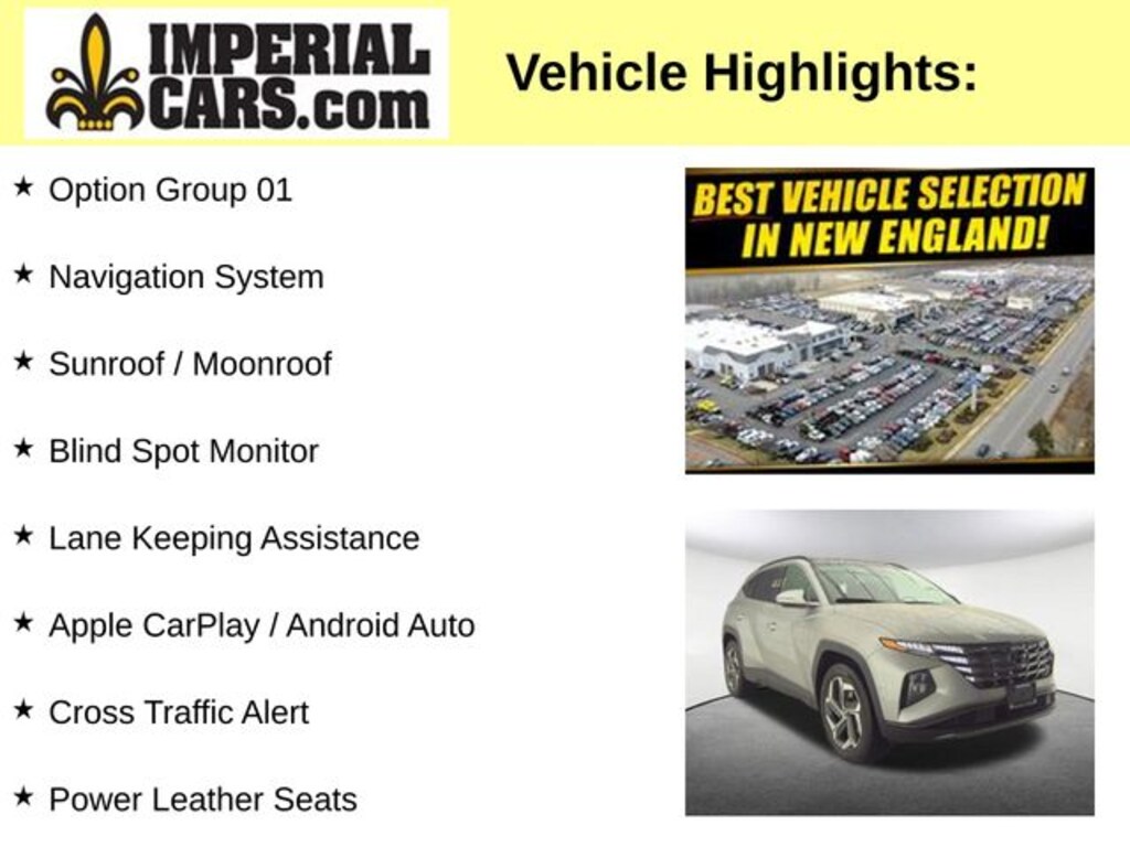 Thank you for your interest in this used 2023 Hyundai Tucson Limited SUV on the lot at Imperial Cars! This Tucson Limited is equipped with a I4 DGI DOHC 16V LEV3-ULEV70 187hp engine and 8-Speed Automatic with SHIFTRONIC transmission. Questions about this Tucson? The experienced team at Imperial Cars is just a phone call away! Contact us at (800) 526-2886 or come in for a test drive! Imperial Cars is your Milford, Framingham, Worcester MA & Providence RI area Hyundai dealership!