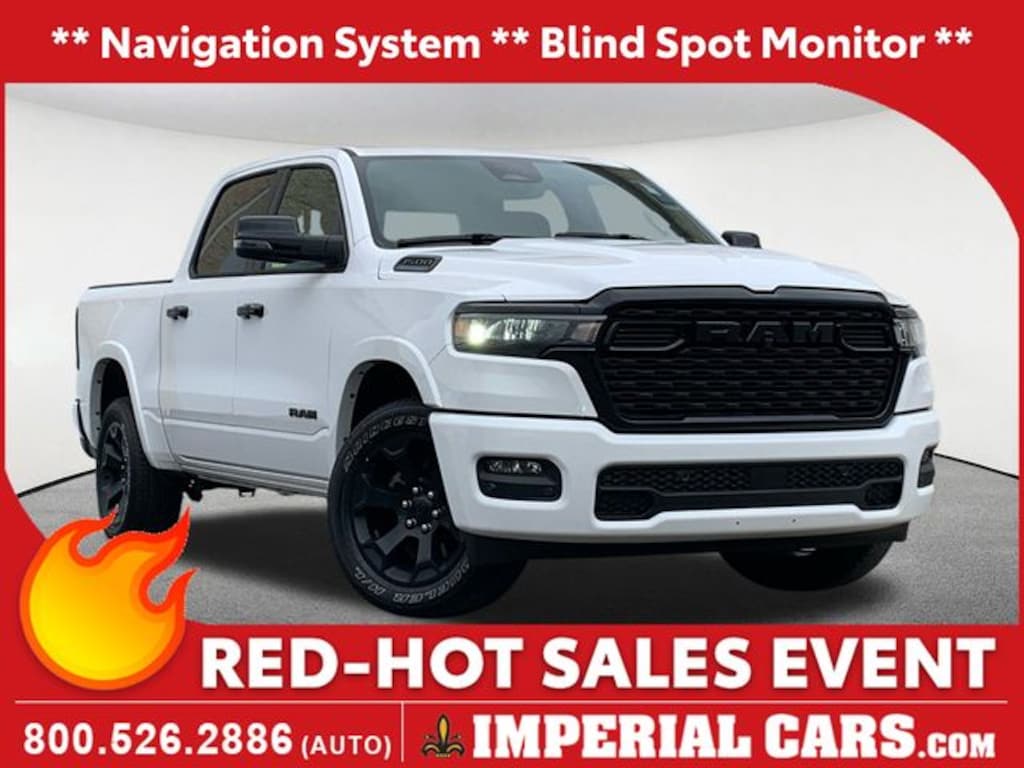 Recent Arrival! Navigation System, Blind Spot Monitor, Lane Keeping Assistance, Apple CarPlay / Android Auto, Adaptive Cruise Control, Cross Traffic Alert, Power Seats, Heated Seats, Backup Camera, Bluetooth, Remote Engine Start, Cruise Control, Power Windows, Power Locks, Steering Wheels Radio Controls, Aluminum Wheels, Towing Package, 115V Auxiliary Power Outlet, 115V Auxiliary Rear Power Outlet, 12" Touchscreen Display, 2nd Row In Floor Storage Bins, 3 Rear Seat Head Restraints, 4 Way Front Headrests, 400W Inverter, 4G LTE Wi-Fi Hot Spot, 9 Amplified Speakers w/Subwoofer, Accent Color Door Handles, Accent Color Premium Power Mirrors, Accent Color Tailgate Handle, Air Conditioning ATC w/Dual Zone Control, Anti-Spin Differential Rear Axle, Apple CarPlay, Auto Power-Folding Mirrors, Auto-Dimming Exterior Driver Mirror, Auto-Dimming Rear-View Mirror, Big Horn Badge, Big Horn Level 2 Equipment Group, Black Exterior Mirrors, Black Exterior Truck Badging, Black Headlamp Bezels, Black Interior Accents, Black Painted Exterior Mirrors Caps, Black Premium Power Mirrors, Black Tail Lamp Bezels, Body Color Front Bumper, Body Color Rear Bumper w/Step Pads, Bucket Seats, Cluster 7.0" TFT Color Display, Configurable Drive Mode, Connected Travel & Traffic Services, Connectivity - US/Canada, Convex Wide-Angle Exterior Mirror Insert, Deluxe Cloth Bucket Seats, Exterior Mirrors Courtesy Lamps, Exterior Mirrors w/Heating Element, Exterior Mirrors w/Supplemental Signals, Front Seat Back Map Pockets, Full Length Floor Console, Glove Box Lamp, Google Android Auto, GPS Antenna Input, GPS Navigation, Grille Black Surround Black Mesh, HD Radio, Heated Front Seats, Heated Steering Wheel, Integrated Voice Command w/Bluetooth, Leather Wrapped Steering Wheel, LED Dome Lamp w/On/Off Switch, LED Footwell Lighting, Manual Adjust 4-Way Front Passenger Seat, Media Hub w/2 Charge Only USBs, Night Edition, Overhead LED Lamps, Power 2-Way Driver Lumbar Adjust, Power Adjust 8-Way Driver Seat, Power Adjustable Pedals, Premium Overhead Console, Quick Order Package 23Z Big Horn, Radio: Uconnect 5 Nav w/12.0" Display, RAM Grille Badge - Black, Rear 60/40 Folding Seat, Rear Center Armrest, Rear Power Sliding Window, Rear Window Defroster, Remote Tailgate Release, Security Alarm, SiriusXM w/360L, Steering Wheel Mounted Audio Controls, Sun Visors w/Illuminated Vanity Mirrors, Universal Garage Door Opener, USB Host Flip, Wheels: 20" x 9.0" Aluminum Painted Clad. Bright White Clearcoat 2025 Ram 1500 Big Horn/Lone Star Night Edition 4D Crew Cab Big Horn/Lone Star Night Edition 4WD 8-Speed Automatic