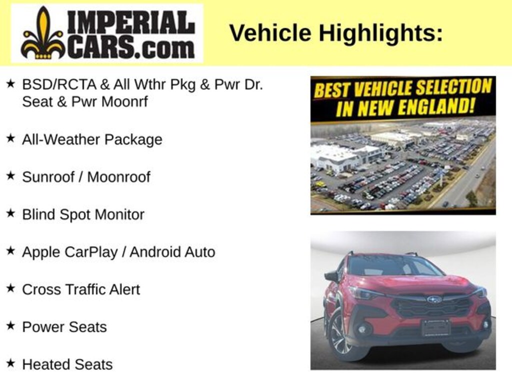 Thank you for your interest in this used 2025 Subaru Crosstrek Premium SUV on the lot at Imperial Cars! This Crosstrek Premium is equipped with a H-4 cyl engine and Lineartronic CVT transmission. Questions about this Crosstrek? The experienced team at Imperial Cars is just a phone call away! Contact us at (800) 526-2886 or come in for a test drive! Imperial Cars is your Milford, Framingham, Worcester MA & Providence RI area Subaru dealership!