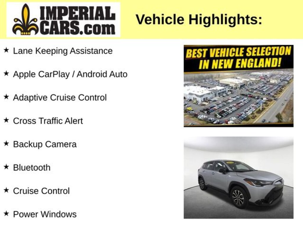 Thank you for your interest in this used 2024 Toyota Corolla Cross Hybrid S SUV on the lot at Imperial Cars! This Corolla Cross Hybrid S is equipped with a I4 PDI Hybrid DOHC 16V LEV3-SULEV30 150hp engine and eCVT transmission. Questions about this Corolla Cross? The experienced team at Imperial Cars is just a phone call away! Contact us at (800) 526-2886 or come in for a test drive! Imperial Cars is your Milford, Framingham, Worcester MA & Providence RI area Toyota dealership!